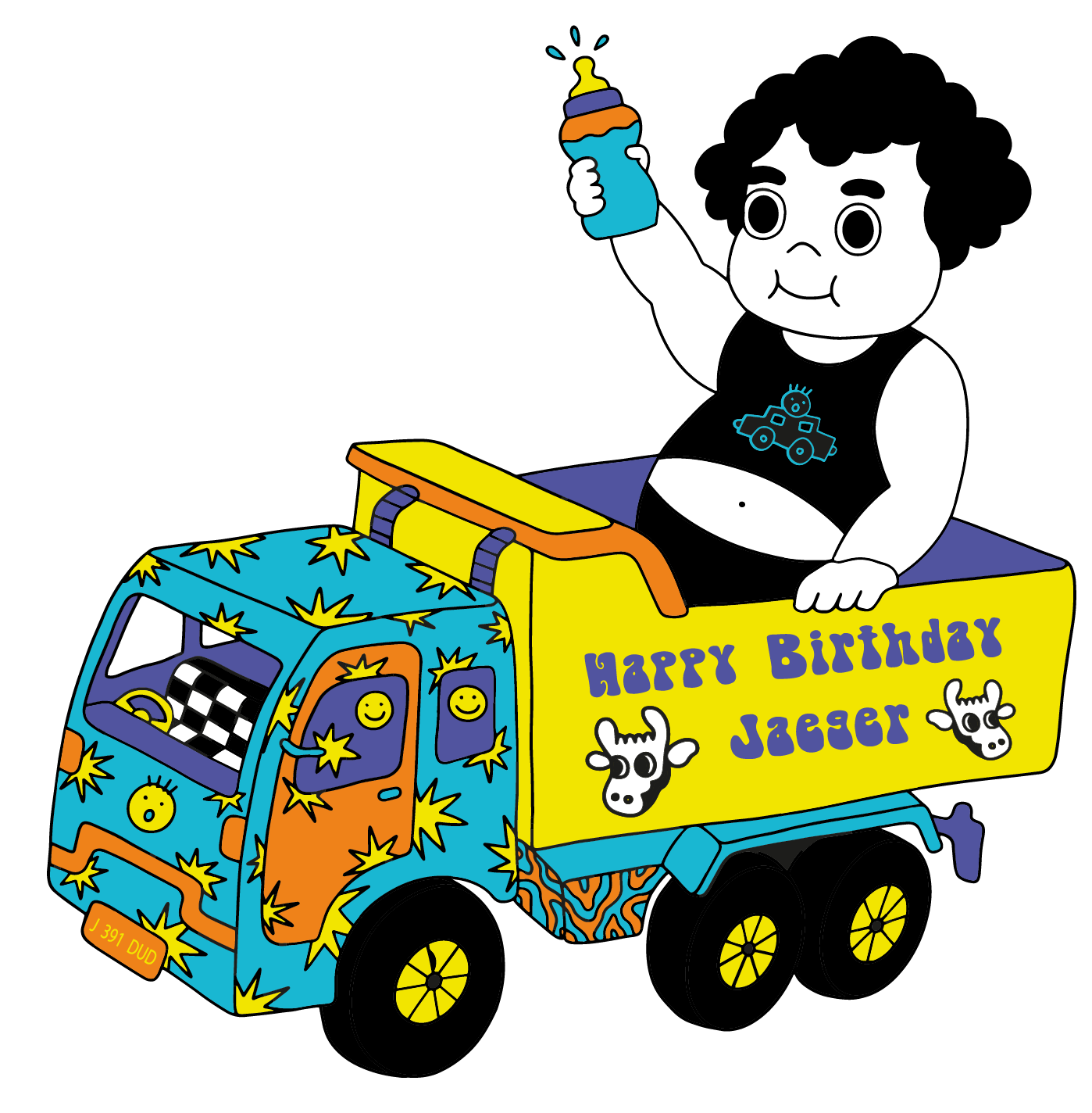 The first piece was from 2020, when he was just one year old. At the time, he was obsessed with anything that moved—especially trucks—and, of course, milk. The illustration was inspired by the trucks Doctor Poop saw around Jakarta, which often feature bold designs on their sides. It also depicts Jaggs himself, happily holding his milk bottle.