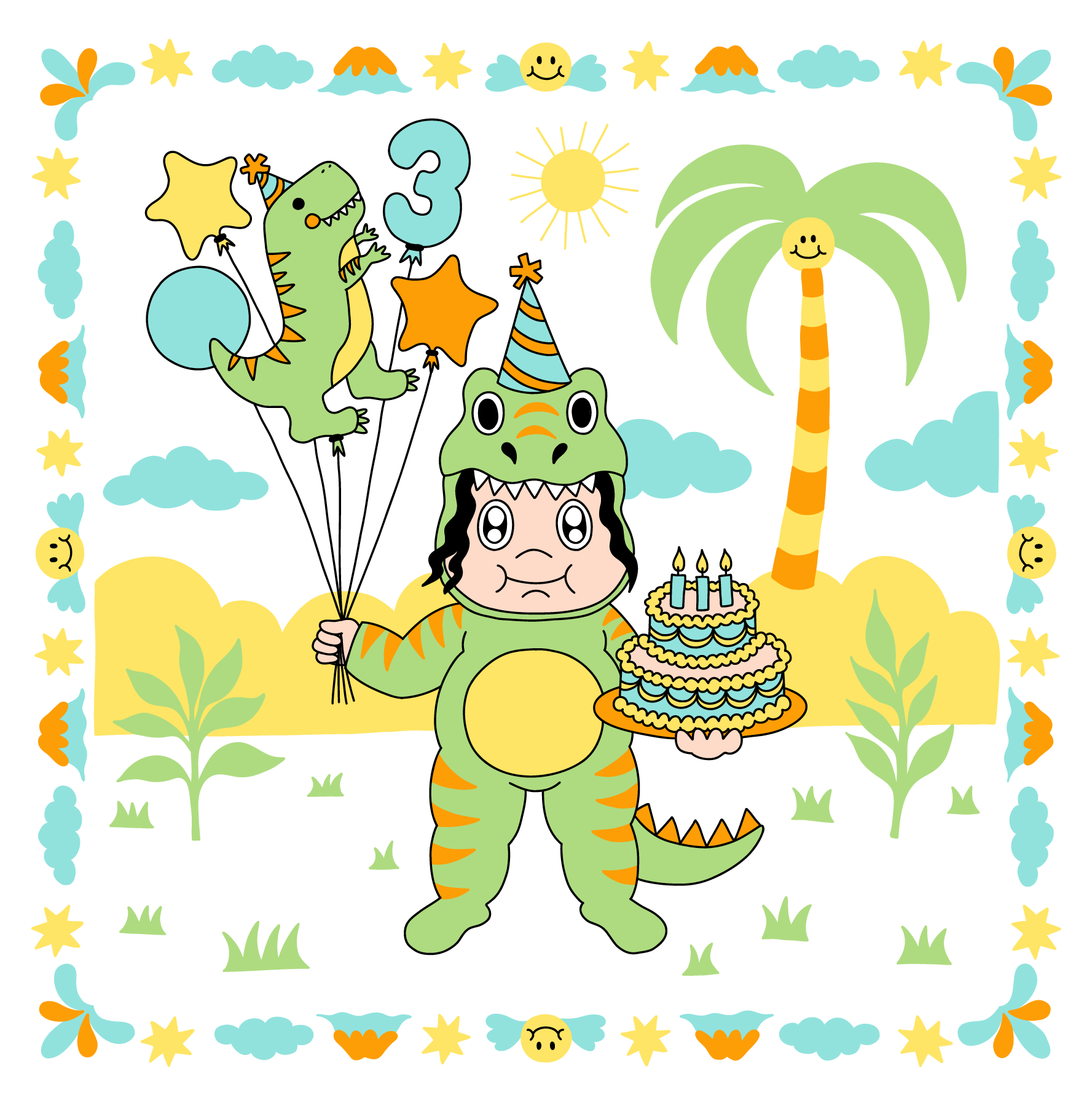 The second piece was for his 3rd birthday in 2022. At that age, he was obsessed with dinosaurs—so Doctor Poop illustrated him in a T-rex costume, complete with balloons and a birthday cake.
