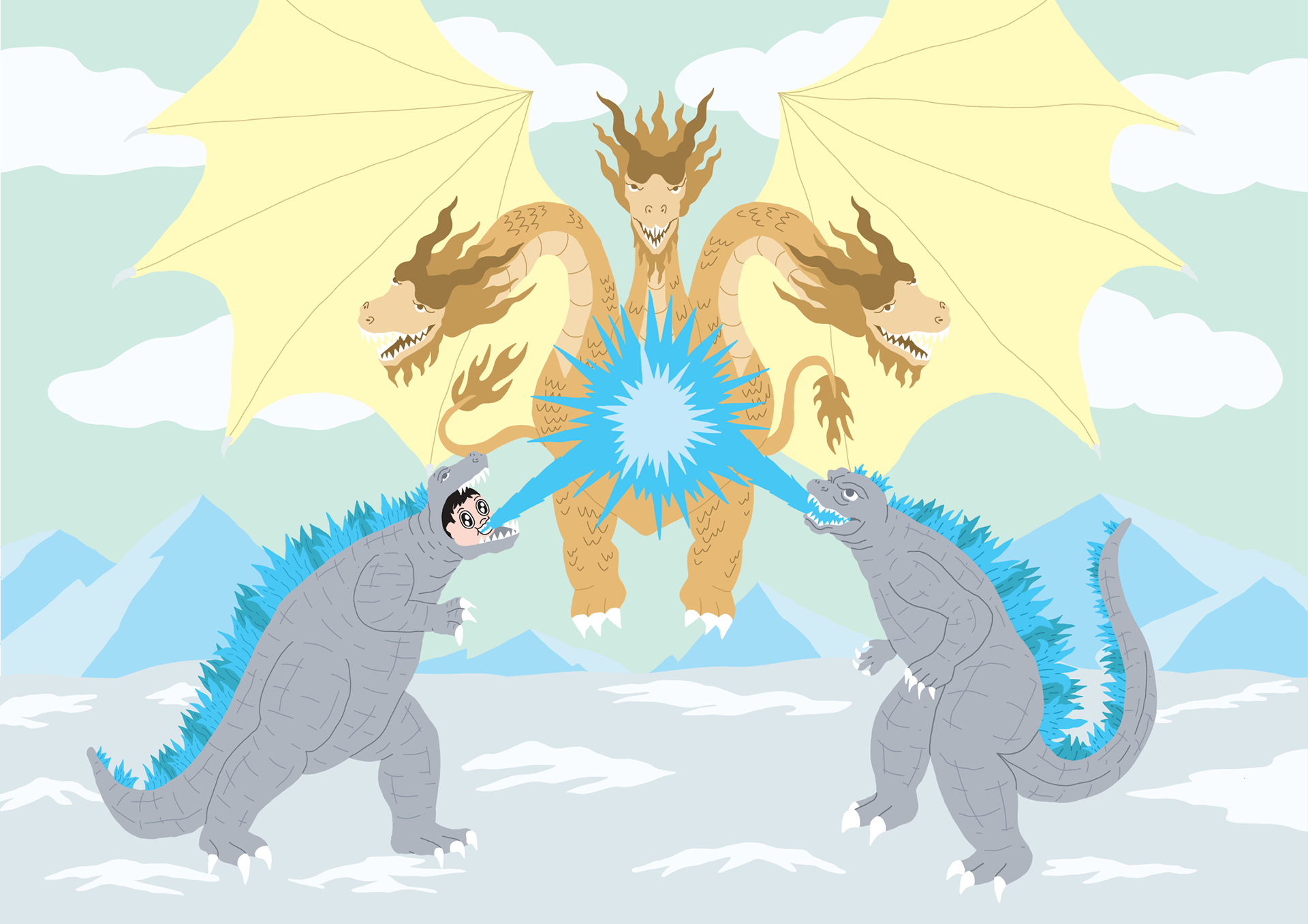 The third piece was for 2024. By this age, his interests had shifted entirely to the world of Godzilla—specifically the rivalry between Godzilla and King Ghidorah. The illustration shows him and Godzilla teaming up to fight Ghidorah with a blue "Atomic Breath" radioactive beam. To make it even more personal, he’s depicted with a missing front tooth, since his first baby tooth had just fallen out at the time!